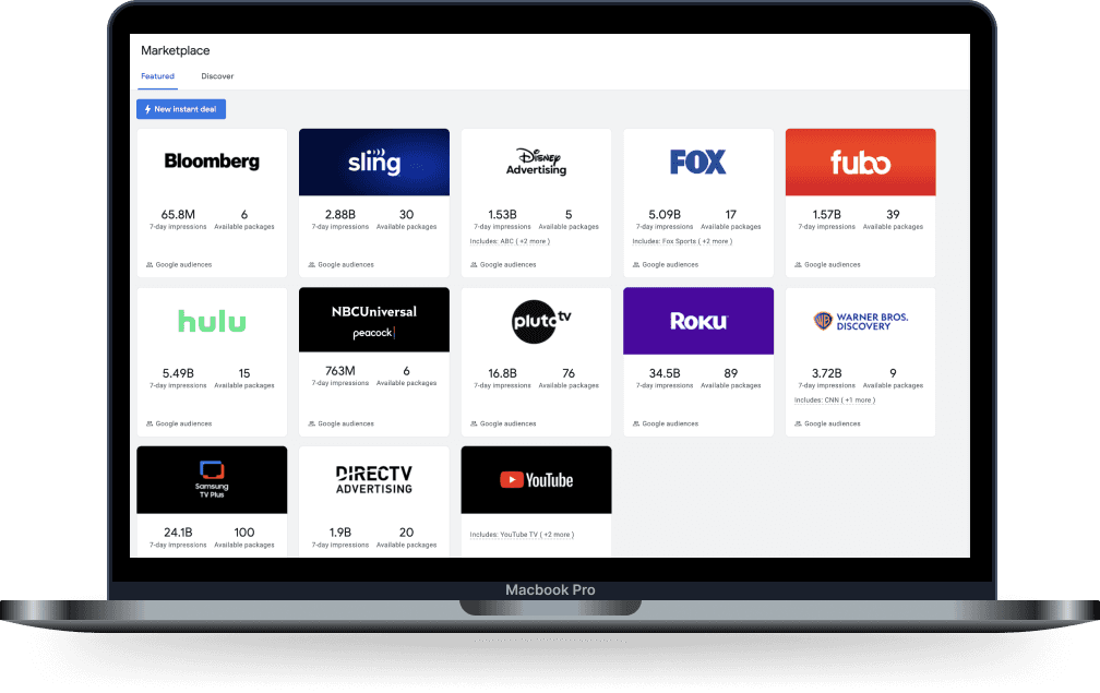 Reach audiences on platforms like Netflix, Hulu, Roku, Disney+, FOX, and Bloomberg, all through Google’s Display & Video 360 platform. Deliver your message on the big screen, where attention is highest.